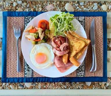 2 жаренных яйца / 2 вареных яйца / омлет / яйца-скрэмбл (яичница-болтунья) подаются с поджаренным хлебом, грибами, помидорами, жаренной картошкой, жаренными или свежими овощами и с беконом, сосисками или ветчиной на выбор.