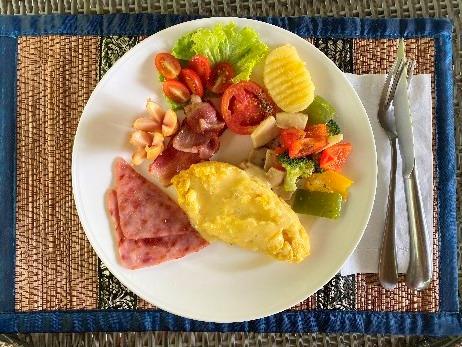 Чай, кофе, горячий шоколад, хлопья, йогурт, молоко, печенье, свежие овощи, фрукты, тосты, масло и джем можно взять со шведского стола.
